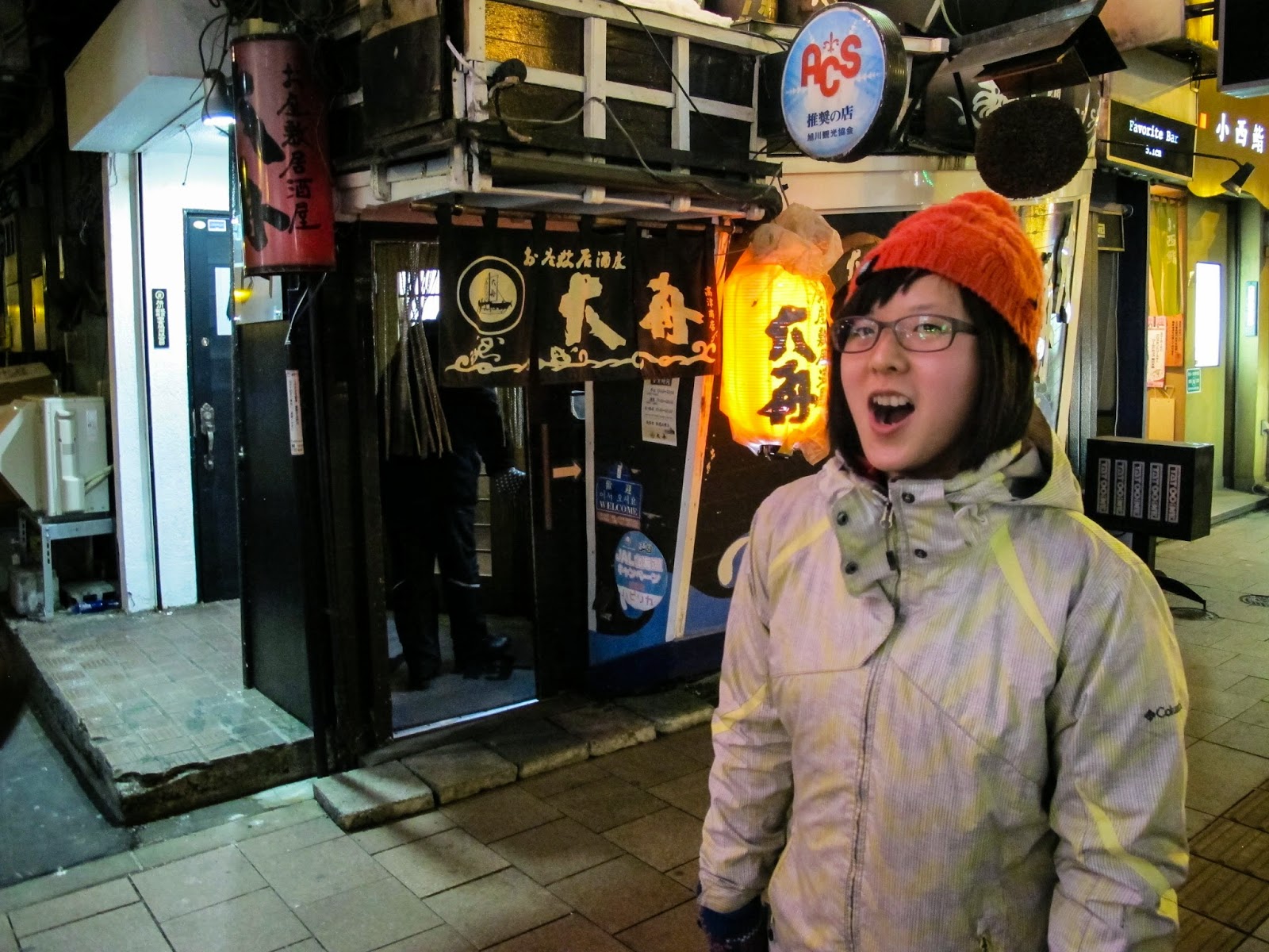 但沒多久看雪人和雪的興奮再度被冷到不行的氣溫逐漸打敗,躲進了mister donuts帶了幾個甜甜圈卻找不到位置休憩後,毅然決定先去居酒屋暖暖身子~~~本以為時間以居酒屋而言還算早,但先查好的一家卻已經沒有位置,但想來也相當正常;日本的居酒屋大多數坐位不多,除非是有包廂式的,不然八個人坐進去通常半家店就滿了。依照在京都多年混在居酒屋(誤)的經驗,反正附近人多的店應該都不會太差,便沿著街往前走了一些,看到了一家以舟為造型的居酒屋,一問之下還有包廂便開心地走進去!沒想到這是個神蹟般的錯誤...到底有多難吃請看蘇蘇進出前的表情XD