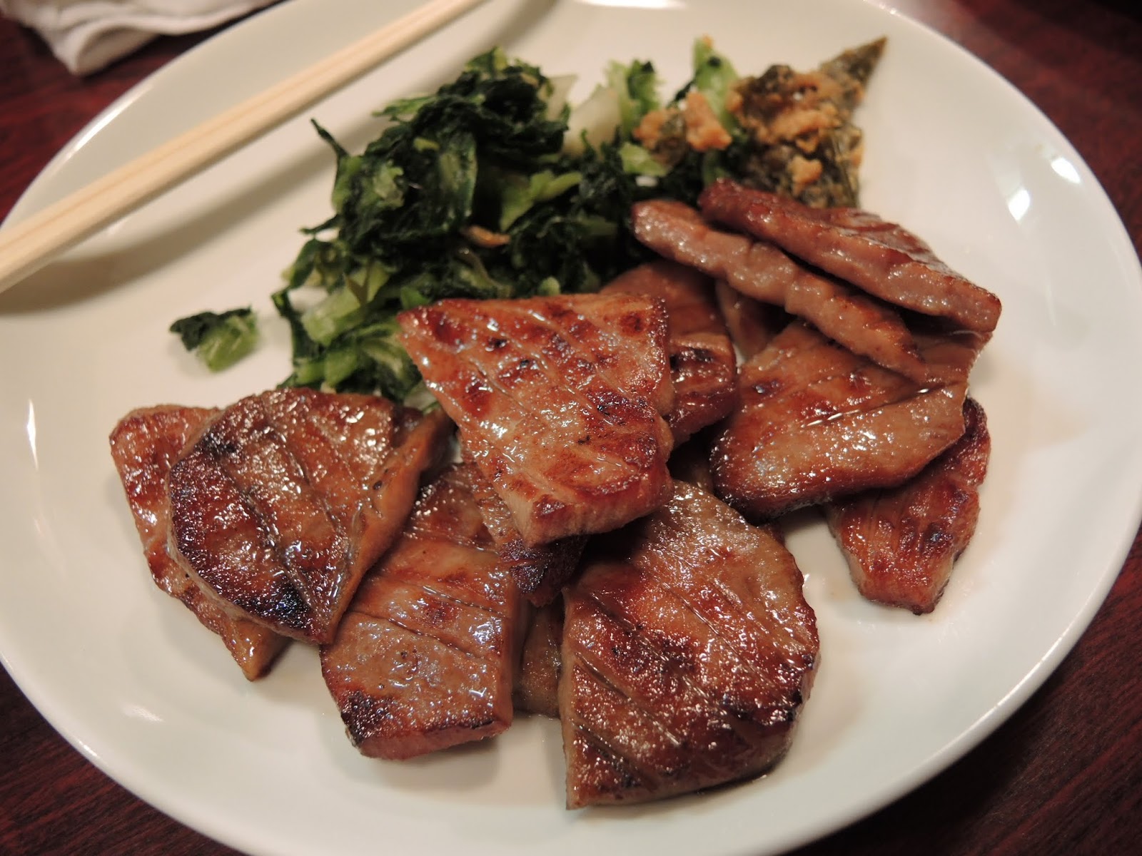 拉開推門等了許久,發現老闆逕自忙進忙出完全沒有要招呼我的意思,我只好率先開口問六位可以進來嗎?沒想到老闆帶著一種「你怎麼不自己進來咧」的表情要我們入坐。帶著不安的心情,我們六個人魚貫而入並坐入這家安靜的店內;Menu很簡單,就只有一人份或1.5人份的牛舌或者定食,看來也沒有厚薄之分。大家便分別點了適合自己份量的定食,我則額外點了啤酒跟一些小菜來試試。
